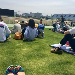 若いかたが個性的なスイーツのブースに並んで写真を撮ったり、馬場の前の芝生スペースで家族連れがピクニック気分で食べたり飲んだり、、、、。